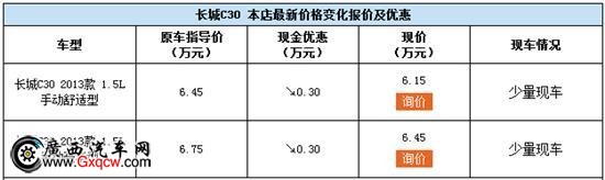 長城C30作為長城汽車進軍家用轎車市場的戰(zhàn)略車型,外觀時尚、空間寬廣、再加上自主品牌的高性價比,自上市以來就頗受青睞。廣西長道暖春特惠,長城C30現(xiàn)金特惠3000元。提供少量現(xiàn)車,感興趣的朋友可以到店或來電咨詢購買。