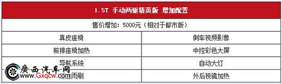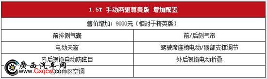 高配的尊貴型比精英型僅僅高出九千元,卻配備了電動天窗和自動空調(diào),電調(diào)座椅,以及右前盲區(qū)可視等高端豪華車型才能擁有的功能,并且能夠選裝氙氣大燈和大燈清洗等功能,安全,方便,非常適合喜歡炫酷的型男和優(yōu)雅時尚的都市白領(lǐng)女性。