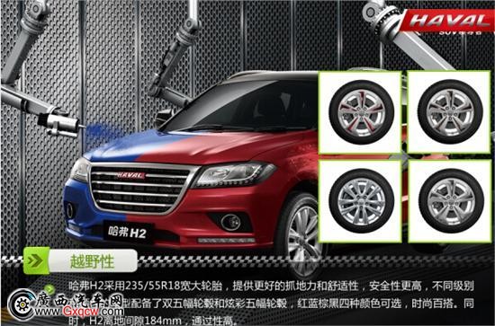哈弗H2擁有SUV的高通過性,接近角22°,離去角27°,空載離地間隙184mm,哈弗H2采用235/55 R18的寬大輪胎,胎寬與中級SUV相當,同級別**。寬大的輪胎可以提供更好的抓地力和舒適性,安全性更高,可以去更多的地方旅行,提高生活質(zhì)量。新推出的哈弗H2四驅(qū)版提供了專業(yè)越野車型的選擇,對于喜歡戶外越野的車友們是個好消息。