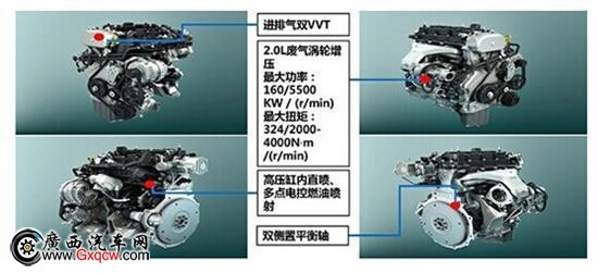該發(fā)動機(jī)主要技術(shù)亮點(diǎn)是:廢氣渦輪增壓,通過廢氣再循環(huán),提高發(fā)動機(jī)的功率與扭矩,相較普通發(fā)動機(jī)可以增加40%的功率,保障了充足的動力輸出。同時(shí),還兼顧了燃油經(jīng)濟(jì)性,采用缸內(nèi)直噴技術(shù),通過內(nèi)置噴油嘴,直接把高壓汽油噴入氣缸,使燃油與空氣混合更均勻,采用雙VVT技術(shù),始終為發(fā)動機(jī)提供**進(jìn)氣量,達(dá)到完美燃燒,降低油耗。而靜音鏈正時(shí)系統(tǒng)、雙平衡軸、雙頂置凸輪軸、充鈉空心氣門、高性能活塞連桿輕量化設(shè)計(jì)等先進(jìn)技術(shù)的應(yīng)用,也有利于汽車使用的穩(wěn)定性、降噪和輕量化,大大提高了整機(jī)的高性能與先進(jìn)性。