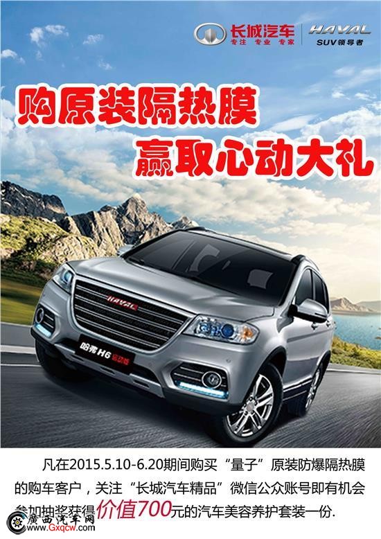 炎炎夏日即將到來,您還在擔(dān)心當(dāng)您午后進(jìn)入愛車的那一刻桑拿浴一般的感覺嗎?三伏天的桑拿浴可不好受。好福利來了!長城汽車為您準(zhǔn)備了一份大禮,凡在2015年5月10日-6月20日期間,販買“量子”原裝防爆隔熱膜的車主可參與抽獎(jiǎng)活動(dòng),贏取心動(dòng)大禮!