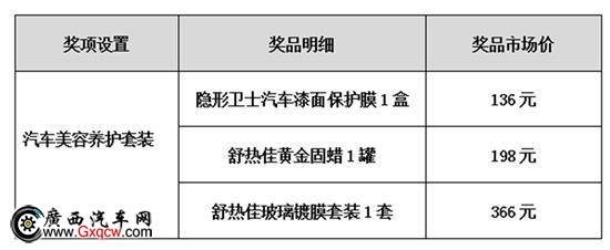 獎(jiǎng)項(xiàng)設(shè)置:價(jià)值700元的汽車美容養(yǎng)護(hù)套裝一份