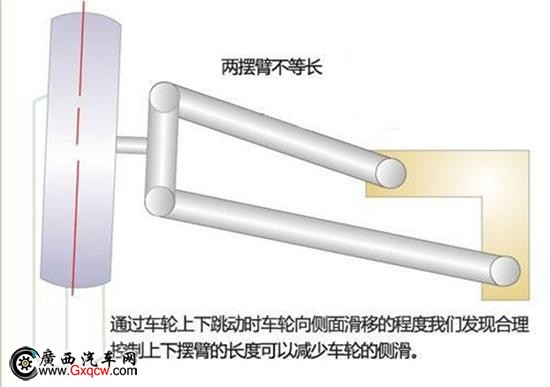雙橫臂式獨立懸架按上下橫臂是否等長,又分為等長雙橫臂式和不等長雙橫臂式兩種懸架。等長雙橫臂式懸架在車輪上下跳動時,能保持主銷傾角不變,但輪距變化大(與單橫臂式相類似),造成輪胎磨損嚴重,現(xiàn)已很少用。目前主流車型都是采取不等長雙橫臂式懸架,只要適當選擇、優(yōu)化上下橫臂的長度,并通過合理的布置、就可以使輪距參數(shù)變化均在可接受的限定范圍內(nèi),保證汽車具有良好的行駛穩(wěn)定性。目前不等長雙橫臂式懸架已廣泛應(yīng)用在轎車的前后懸架上,部分運動型轎車及賽車的后輪也采用這一懸架結(jié)構(gòu)。