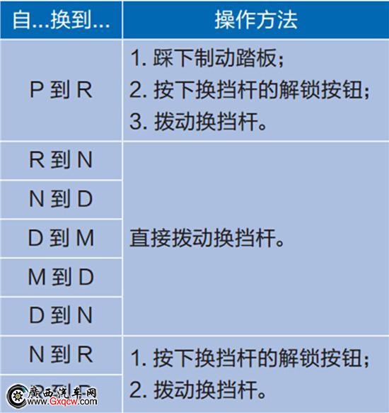 倒車擋用于倒車。要從其它擋位切換至倒車擋時,應(yīng)先使汽車完全停下來,然后再將換擋桿移至倒車擋。