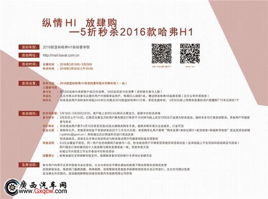 3月18日—29日期間,客戶登錄哈弗商城(http://mall.haval.com.cn/)注冊(cè),并支付9.9元即可獲得半價(jià)秒殺權(quán)。秒殺活動(dòng)于3月30日上午10:00開啟,最快完成1000元車輛訂金支付的用戶即為秒殺成功。