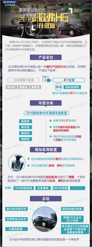 2016款哈弗H6升級版超值上市,售價(jià)為8.88萬元起。新車搭載6MT、6AT變速器,兩驅(qū)、四驅(qū)共計(jì)10種配置可選。在保持原有超高品質(zhì)的前提下,2016款哈弗H6升級版對售價(jià)和配置進(jìn)行了優(yōu)化。本期通過一張圖的形式帶您直觀的了解這款車型。
