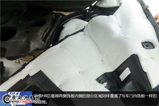 通常車輛的后備廂部分也是重要的噪音源,特別是來自輪胎、懸架系統(tǒng)以及風(fēng)等形成的混合噪音,所以在此區(qū)域加強(qiáng)隔音降噪同樣很重要。哈弗H8在此方面可謂下足了功夫。