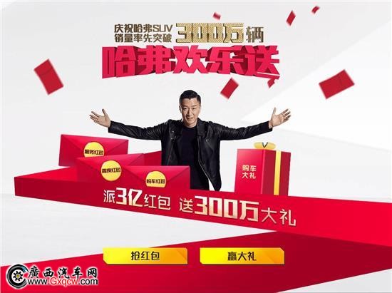 6月20日,長城汽車對外宣布:為慶祝哈弗SUV銷量率先突破300萬輛,將推出“慶祝哈弗SUV銷量率先突破300萬輛,感恩歡樂送——派3億紅包,送300萬大禮”的感恩活動,來答謝廣大用戶。據(jù)悉,“派3億紅包,送300萬大禮,感恩歡樂送”活動將提供總額超過3億的紅包以及總價值達到300萬的精美獎品,為新老車主提供購車、服務(wù)、置換等全方位的實惠和驚喜。