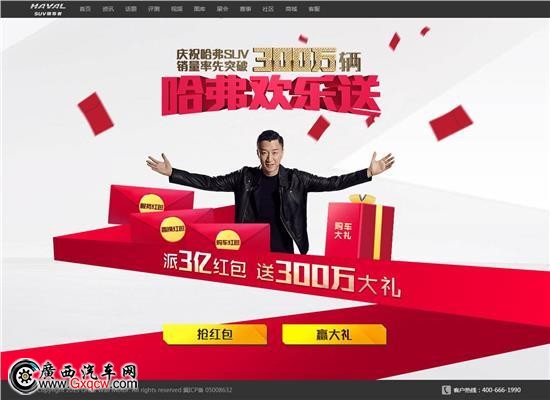為慶祝哈弗SUV銷(xiāo)量率先突破300萬(wàn)輛,哈弗推出“慶祝哈弗SUV銷(xiāo)量率先突破300萬(wàn)輛,感恩歡樂(lè)送——派3億紅包,送300萬(wàn)大禮”的感恩活動(dòng),來(lái)答謝廣大用戶。哈弗H2車(chē)型紅包持續(xù)派發(fā)中,紅包金額直減車(chē)價(jià),還不來(lái)?yè)?