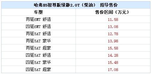 近日,長城汽車的哈弗H5智尊版綠靜2.0T柴油車上市,新動(dòng)力搭載了長城的2.0T自主發(fā)動(dòng)機(jī),匹配6擋手動(dòng)和5擋自動(dòng)兩種變速箱,有四驅(qū)和兩驅(qū)兩種,一共八款車型,售價(jià)在11.58 -17.08萬元。具體車型價(jià)格如下:廣西長道汽車為了感謝廣大八桂車友會(huì)我們的支持和厚愛,特在2012年2月15日——2月29日,針對(duì)哈弗H5智尊2.0T綠靜車型進(jìn)行年度型鉅惠,現(xiàn)金——豪華禮包,*高達(dá)到8000元,現(xiàn)車數(shù)量有限,優(yōu)惠詳情請(qǐng)咨詢我公司購車熱線。