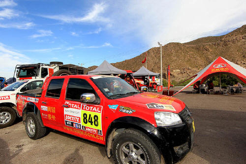 在哈弗達(dá)喀爾車隊(duì)的服務(wù)車中,有一輛編號(hào)為848的風(fēng)駿皮卡,這已經(jīng)是繼2011達(dá)喀爾后,長城風(fēng)駿第二次隨隊(duì)出征達(dá)喀爾。除了在賽場(chǎng)為車隊(duì)提供最快最及時(shí)的服務(wù),智利經(jīng)銷商還組織眾多當(dāng)?shù)仫L(fēng)駿車主驅(qū)車到現(xiàn)場(chǎng)進(jìn)行助威。風(fēng)駿車隊(duì)成為賽場(chǎng)邊上一道亮麗的風(fēng)景線。