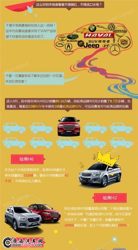 SUV市場已經(jīng)從“紅!毕颉吧罴t”演變,但哈弗品牌繼續(xù)保持強勁的增長勢頭。9月份哈弗銷售87627輛,同比勁增59.39%;前9月累計銷售590330輛,同比增長23.23%,毫無懸念地穩(wěn)坐SUV銷量冠軍寶座。