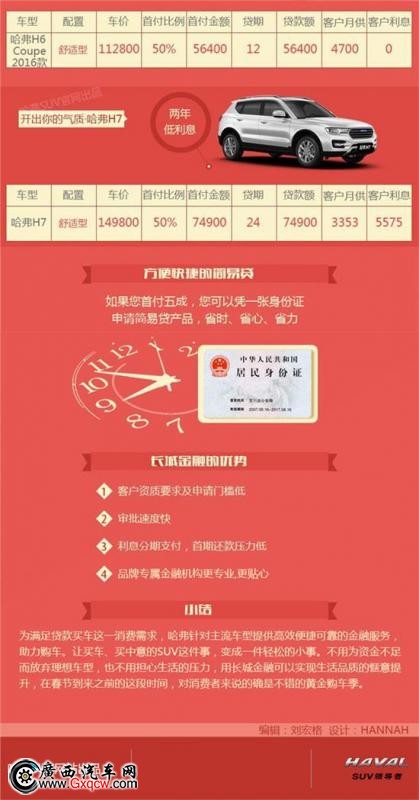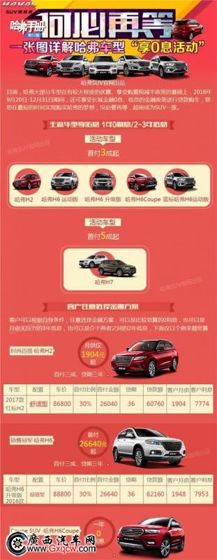 2016年9月20日-12月31日期間,哈弗SUV推出享受0息、低息的金融政策進(jìn)行貸款購車,讓買車、買中意的SUV這件事,變成一件輕松的小事。不用為資金不足而放棄理想車型,也不用擔(dān)心生活的壓力,用長(zhǎng)城金融可以實(shí)現(xiàn)生活品質(zhì)的愜意提升。
