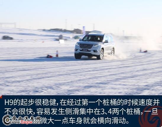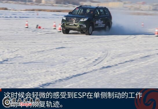 與我們平時(shí)在鋪裝路面進(jìn)行的蛇形繞樁不同的是,在冰湖這種摩擦系數(shù)不到0.1的路面上,要又快又平穩(wěn)的駕駛非常不容易,很容易發(fā)生失控的問(wèn)題。在冰湖上蛇形繞樁的樁桶相對(duì)來(lái)說(shuō)間距也更大一些,這個(gè)項(xiàng)目的目的是感受車輛在濕滑低附著力路面上的操控性,并且檢測(cè)車輛的ESP工作的效果。因?yàn)檠b配了雪地胎的原因,H9的起步很穩(wěn)健,在經(jīng)過(guò)**個(gè)樁桶的時(shí)候速度并不會(huì)很快,容易發(fā)生側(cè)滑集中在3、4兩個(gè)樁桶,一旦方向打的稍微大一點(diǎn)車身就會(huì)橫向滑動(dòng),這時(shí)候ESP就會(huì)介入干預(yù)剎車和限制驅(qū)動(dòng)力,盡量的把車身挽救回來(lái),這個(gè)時(shí)候也不要大力的剎車,而是通過(guò)方向一點(diǎn)點(diǎn)找到車輛的軌跡,把車身救回來(lái)。