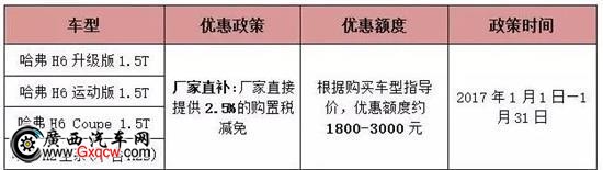 從2017年1月1日起, 1.6L及以下排量車型的購置稅減免由5%調(diào)整為7.5%,很多顧客錯(cuò)失了購車良機(jī),后悔不已。哈弗深知,“開新車過大年”是很多顧客的夢想,為了讓更多顧客輕松開上好車,將對哈弗H6 1.5T(升級版/運(yùn)動版/Coupe)、以及哈弗H2全系(不含H2s)車型提供2.5%的“廠家直補(bǔ)”。也就是說,購買上述車型,都將繼續(xù)享受購置稅減半政策。