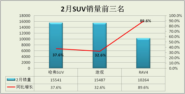 在經(jīng)歷了1月同比、環(huán)比大幅下降的考驗(yàn)后,2月SUV市場找回了狀態(tài),以高于30%的速度繼續(xù)保持快速發(fā)展。與上月相比哈弗、漢蘭達(dá)、CR-V等主流車型都呈現(xiàn)快速增長,但遺憾的是月銷量過萬的僅三個(gè)品牌,哈弗、途觀、RAV4,分別以15541輛、15487輛、10264輛的銷售成績位列三甲。