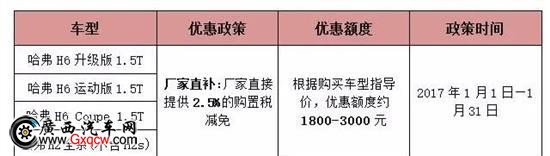 2017年起國家下調(diào)了小排量汽車購置稅優(yōu)惠幅度,將排量1.6L及以下乘用車的購置稅優(yōu)惠從5%改為按照7.5%來征收(國家法定車輛購置稅的稅率為10%)。2017年1月1日起執(zhí)行的小排量購置稅新政,讓很多顧客錯過了購車時機(jī),為了成全更多用戶的購車夢想,哈弗推出了廠家直補(bǔ)措施,對哈弗H6 1.5T(升級版/運動版/Coupe)、以及哈弗H2全系(不含H2s)車型提供2.5%的“廠家直補(bǔ)”。也就是說,購買上述車型,都將繼續(xù)享受購置稅減半政策。
