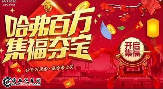 “百萬(wàn)哈弗,集福奪寶”活動(dòng)于2月9日10:00正式上線,結(jié)束時(shí)間為2月19日20:30,用戶掃描或識(shí)別上方二維碼,授權(quán)微 信登錄即可參與,福卡的獲取途徑、獎(jiǎng)品的領(lǐng)取方式、紅包的使用規(guī)則等詳見(jiàn)活動(dòng)頁(yè)面。