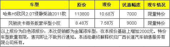 活動(dòng)內(nèi)容:本次促銷活動(dòng)針對(duì)長(zhǎng)城汽車哈弗、皮卡全系車型開展,以下兩款車型僅為優(yōu)惠舉例。如需了解其他車型優(yōu)惠,請(qǐng)致電我公司。