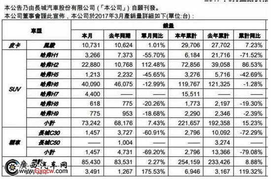 4月7日,長城汽車對外發(fā)布了2017年3月產(chǎn)銷快報:3月份長城汽車月銷8.54萬輛,環(huán)比增長10%,同比增長2%。其中,哈弗品牌銷售7.32萬輛,同比增長7.43%,環(huán)比增長9.51%;風(fēng)駿皮卡銷售1.07萬輛。