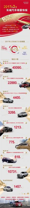 4月7日,長城汽車對(duì)外發(fā)布了2017年3月產(chǎn)銷快報(bào):3月份長城汽車銷售8.54萬輛,環(huán)比增長10%,同比增長2%。其中,哈弗品牌銷售7.32萬輛,同比增長7.43%,環(huán)比增長9.51%;風(fēng)駿皮卡銷售1.07萬輛。