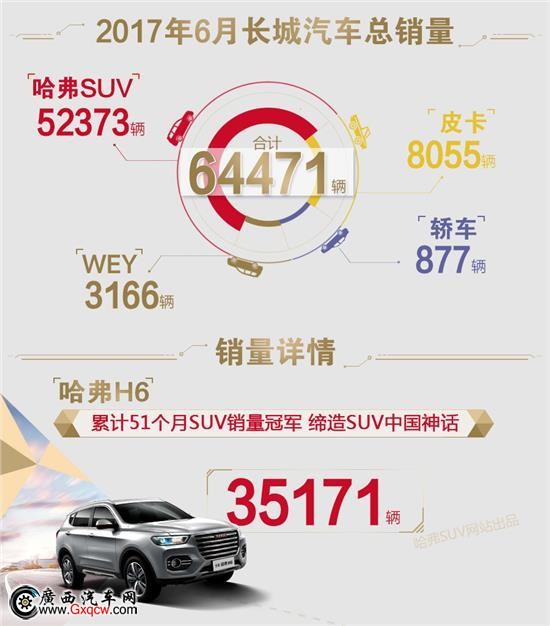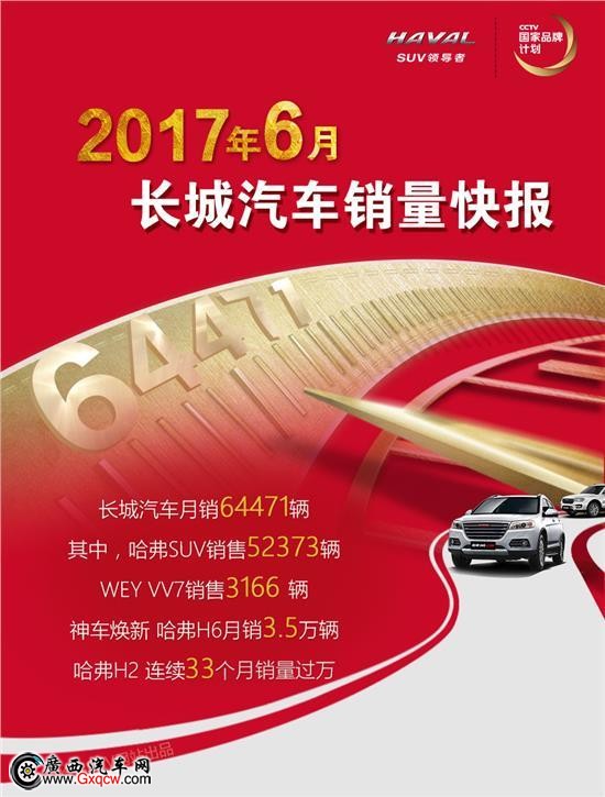 長城汽車2017年6月銷量快報(bào):長城汽車共計(jì)銷售汽車64471輛,其中哈弗SUV銷售52373輛,皮卡銷售8055輛,轎車銷售877輛。今年上半年,長城汽車?yán)塾?jì)銷售460743輛,其中哈弗SUV銷售394540輛。
