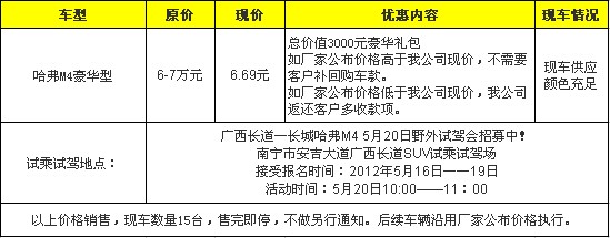 長城哈弗M4,作為長城汽車2012年度重點(diǎn)推出的車型,從首批車抵達(dá)南寧廣西長道4S店開始,等待這款車型的愛好者的來電,來訪邊絡(luò)繹不絕,在4月28日到5月1日的第八屆北部灣(南寧)汽車展上,廣西長道取得了展會(huì)銷售100臺(tái)的上佳績(jī)表現(xiàn),其中哈弗M4的訂單數(shù)在20臺(tái)以上。為了感謝廣大車友一直以來對(duì)長城汽車的支持和厚愛,我公司計(jì)劃于本月組織哈弗M4試乘試駕會(huì),在讓廣大車友進(jìn)一步了解哈弗M4的同時(shí),更可以體會(huì)到我們廣西長道服務(wù),**一步的承諾。
