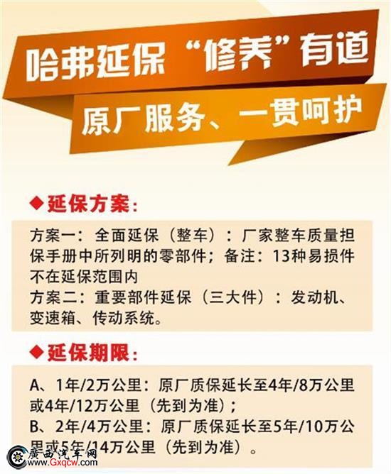 哈弗延保按保障范圍來(lái)分有發(fā)動(dòng)機(jī)、變速器及傳動(dòng)系統(tǒng)的三大件延保、也有非易損件的全面延保;按延保期限來(lái)分,有1年/2萬(wàn)公里、2年/4萬(wàn)公里兩種。消費(fèi)者只要符合延保服務(wù)約定的購(gòu)買(mǎi)條件,就可以量身購(gòu)買(mǎi)延保服務(wù),哈弗就可以為保修期滿的車(chē)輛繼續(xù)提供質(zhì)量擔(dān)保,承擔(dān)由此產(chǎn)生的所有維修費(fèi)用,包括人工費(fèi)、配件費(fèi)。