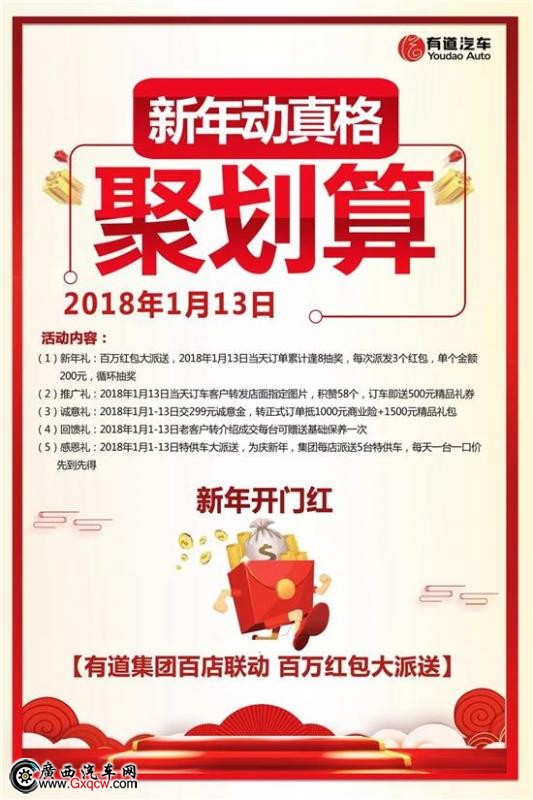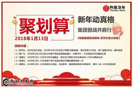 5、有道集團(tuán)感恩禮: 2018年1月1-13日特gong車大派送,為慶新年,集團(tuán)每店派送5臺特gong車,每天一臺一口價(jià),先到先得!