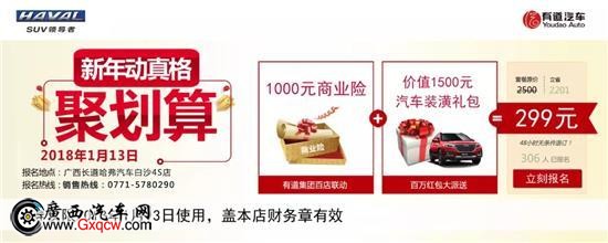 3、有道集團(tuán)誠意禮: 2018年1月1-13日交299元誠意金,轉(zhuǎn)正式訂單即可抵1000元商業(yè)險(xiǎn) 1500元精品禮包!