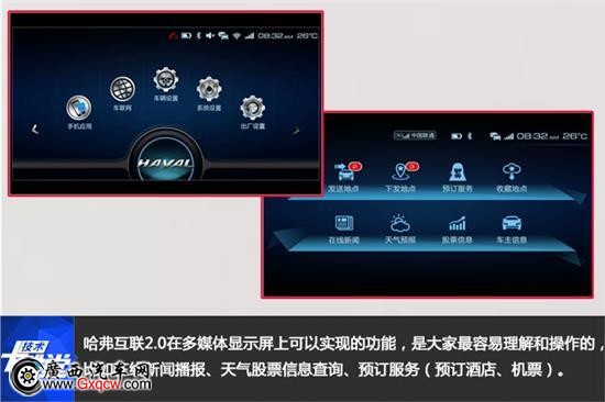 哈弗互聯(lián)2.0在多媒體顯示屏上可以實(shí)現(xiàn)的功能是大家最容易理解和操作的。比如在線新聞播報(bào)、天氣及股票信息查詢、預(yù)訂服務(wù)(預(yù)訂酒店、機(jī)票),同時(shí)可以在“車主信息”處修改個(gè)人手機(jī)號(hào)和設(shè)置安防密碼等。