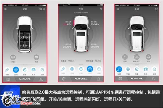 哈弗互聯(lián)2.0功能通過(guò)多媒體顯示屏、內(nèi)后視鏡、手機(jī)APP實(shí)現(xiàn),這三個(gè)不同的終端可以分別實(shí)現(xiàn)不同的功能。與第壹階段車聯(lián)網(wǎng)系統(tǒng)相比,哈弗互聯(lián)2.0*大亮點(diǎn)為遠(yuǎn)程控制,這也是現(xiàn)在消費(fèi)者比較追崇的功能,這個(gè)功能就是直接通過(guò)手機(jī)APP來(lái)實(shí)現(xiàn)。手機(jī)端下載哈弗互聯(lián)APP后,可通過(guò)APP對(duì)車輛進(jìn)行遠(yuǎn)程控制,包括遠(yuǎn)程開/關(guān)引擎、開/關(guān)空調(diào)、遠(yuǎn)程鳴笛閃燈、遠(yuǎn)程開/關(guān)門鎖。這些功能在一些用車場(chǎng)景里,能給消費(fèi)者提供很好的便利。比如在大型停車場(chǎng)快速的尋找車輛、冬天或夏天在用車前開啟空調(diào)等等,這些功能您一旦試用,就會(huì)非常幸福的依賴它。