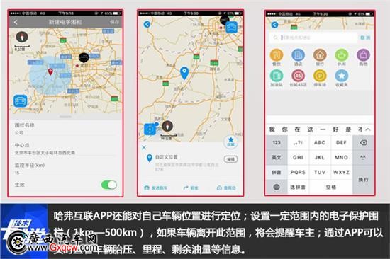 除了以上功能,哈弗互聯(lián)APP還能對(duì)自己車輛位置進(jìn)行定位;設(shè)置一定范圍內(nèi)的電子保護(hù)圍欄(1km—500km),如果車輛離開此范圍,將會(huì)提醒車主;當(dāng)車輛車門異常打開后,車主將收到異常提醒信息;通過(guò)APP可以實(shí)時(shí)查看車輛胎壓、里程、剩余油量等信息。這些功能的使用,車主能通過(guò)手機(jī)足不出戶,掌控車輛的行蹤和基礎(chǔ)信息。舉個(gè)例子,如果您把車輛外借,可以通過(guò)這些功能,輕松的了解車輛被使用的情況。