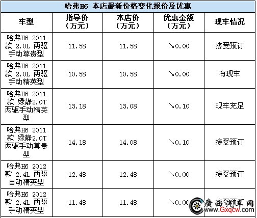 近日,廣西長(zhǎng)道店內(nèi)哈弗H6有部分現(xiàn)車,顏色也基本齊全。喜歡哈弗H6的顧客,千萬(wàn)不要錯(cuò)過(guò)了,在炎炎夏日里,廣西長(zhǎng)道的放暑“價(jià)”活動(dòng)。顧客訂哈弗H6柴油版即享現(xiàn)金優(yōu)惠1000元,更有送10萬(wàn)元第三者責(zé)任險(xiǎn)和超值大禮包。喜歡該車的朋友不妨到店面談或電話咨詢。具體車型及價(jià)格參見下表: