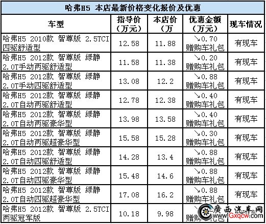 即將于2012年9月7日北部灣(第九屆)汽車展在南寧國際會展中心開幕,為了感謝新老客戶對廣西長道的大力支持,廣西長道車在展期間派發(fā)“福利”,長城汽車哈弗、皮卡全系車型全年鉅惠。本次車展,哈弗H5*高綜合優(yōu)惠10000元優(yōu)惠(含3000元禮包)。車展上,在長城汽車廣西長道4S旗艦店展位F11購車或訂車客戶,都有機會抽取HTC智能大獎、充氣泵、代金券、實用禮品等,等您來拿。(活動細(xì)則以車展現(xiàn)場工作人員解說為準(zhǔn))喜歡哈弗H5的朋友歡迎致電我公司咨詢。廣西長道:0771-2330301 (安吉4S店)0771-6735498(白沙店)0771-3922501(安吉直營店)。