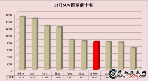 哈弗H6、iX35、CR-V、途觀、智跑、瑞虎、哈弗M4、Q5、S6、哈弗H5,分別以15120輛、14580輛、12559輛、12106輛、8491輛、8131輛、7981輛、7946輛、7765輛、6115輛的成績(jī),位列SUV細(xì)分市場(chǎng)的1―10名。