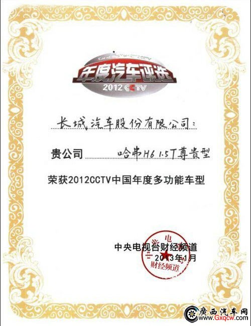 “CCTV年度車型評選活動”由中國中央電視臺主辦,中國汽車技術(shù)研究中心協(xié)辦,邀請數(shù)十位國內(nèi)權(quán)威汽車行業(yè)專家、汽車媒體意見領(lǐng)袖和業(yè)界代表組成權(quán)威評審團,通過對入圍車型進行嚴(yán)謹(jǐn)?shù)膶嶋H測試和投票,最終決出各獎項獲獎車型,堪稱國內(nèi)最具公信力、最具權(quán)威性、最具群眾基礎(chǔ)的汽車評選活動之一。自2005年以來已經(jīng)成功舉辦了8屆,在業(yè)內(nèi)和汽車消費領(lǐng)域形成了強大的社會影響力,每年一屆的評選活動,已經(jīng)成為消費者購車的重要參考;而每年的獲獎車型也成為下一年暢銷車型的風(fēng)向標(biāo)。本屆評選中,哈弗H6經(jīng)受住全體專家評委的嚴(yán)格測試,力克群雄,斬獲“CCTV2012年度SUV大獎”。