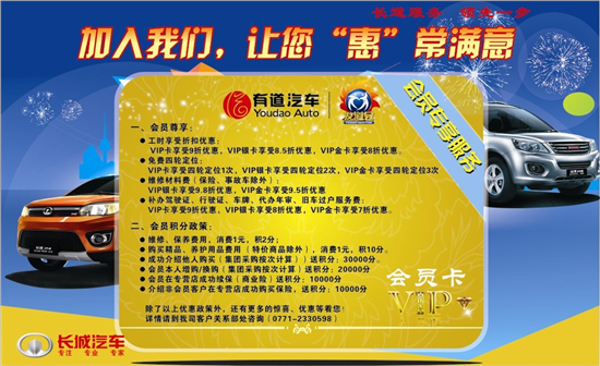 長(zhǎng)城汽車聚焦廣西,廣西長(zhǎng)道白沙旗艦店繼北部灣車展銷量突破歷史,現(xiàn)在旗艦店會(huì)員招募行動(dòng)火爆啟動(dòng)!加入廣西長(zhǎng)道車友會(huì)員大家族,您即可享受到VIP至尊服務(wù)和一系列優(yōu)惠內(nèi)容!*高VIP金卡更可享受8折優(yōu)惠內(nèi)容!會(huì)員熱線:【廣西長(zhǎng)道:(白沙4S店)0771-5780390;(安吉4S店)0771-2330301;(安吉直營(yíng)店)0771-3922501 】