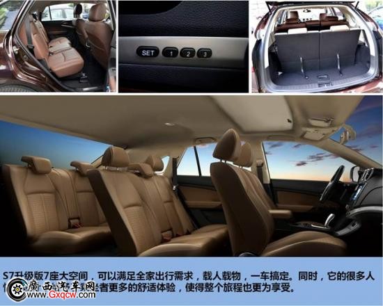 有了7座大空間SUV,再也不需要為全家出游開兩輛車而苦惱了。而且S7的后排腿部空間十分寬裕,乘坐十分舒適,即便是長途旅行也不會產生過多的疲憊感,而且后備箱很大,座椅也可以靈活組合,再多物品也不怕,是全家出行的**伴侶。