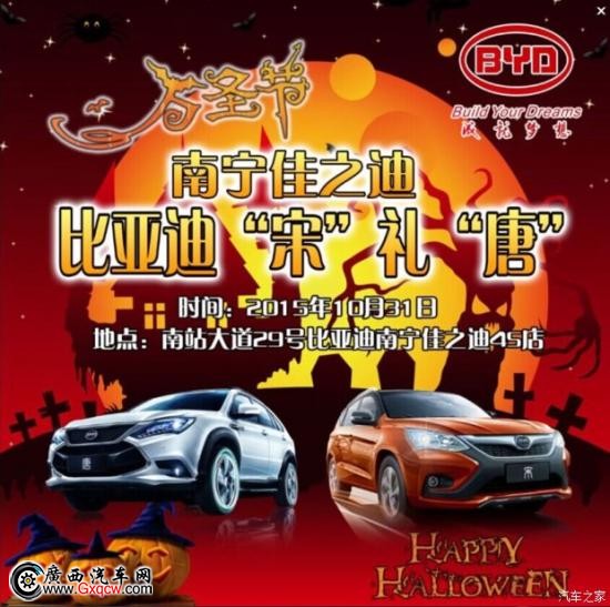萬圣節(jié),還在玩化裝舞會(huì)嗎?OUT啦!快來參加比亞迪南寧佳之迪狂歡萬圣節(jié)——比亞迪“宋”禮“唐”,狂享購(gòu)車鉅惠季,買車要happy,萬圣節(jié)再也不要驚悚要驚喜,進(jìn)店即可獲得精美禮品一份哦!