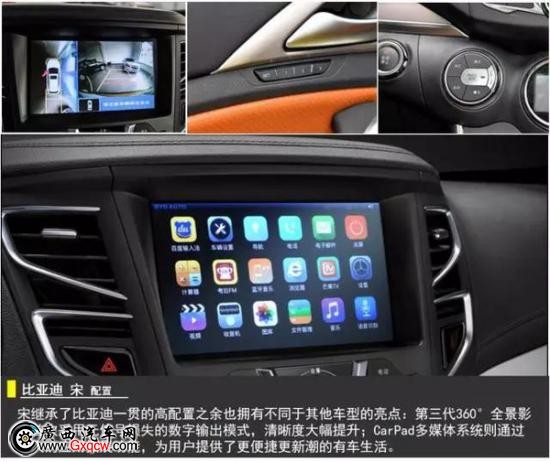 高配置是我們對比亞迪產(chǎn)品一貫的印象,宋也毫無例外地繼承了這一優(yōu)勢。如PM2.5綠凈系統(tǒng)、行車記錄儀、記憶聯(lián)動系統(tǒng)等高大上配置一應(yīng)俱全。值得稱道的是,當(dāng)很多車聯(lián)網(wǎng)車型還停留在測試階段時,比亞迪宋已經(jīng)正式上市,其搭載的CarPad多媒體系統(tǒng)通過強大的應(yīng)用拓展功能,為用戶提供了更便捷更新潮的有車生活。