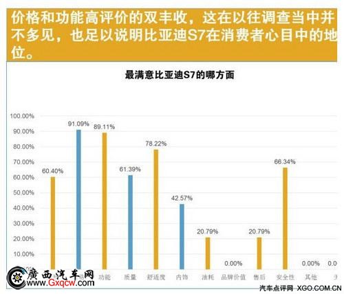 高科技配置一直是比亞迪車(chē)型的強(qiáng)項(xiàng),S7也不例外,在同價(jià)位車(chē)型中,你很難找到能與之匹敵的競(jìng)爭(zhēng)對(duì)手。而且,在本次調(diào)查中,車(chē)主也反映這些配置“十分實(shí)用”、“使用情況良好”,還有部分車(chē)主用“加量不加價(jià)”來(lái)評(píng)價(jià)S7升級(jí)版。所以,在“最滿意的地方”一項(xiàng)中,比亞迪S7的“價(jià)格”、“功能”、“舒適”以及“安全”四大方面獲得了充分肯定,其中選擇了“價(jià)格”和“功能”的,更是分別高達(dá)91.09%和89.11%。據(jù)了解,在價(jià)格和功能兩方面獲這么高評(píng)價(jià)的車(chē)型在以往同類的調(diào)查當(dāng)中并不多見(jiàn),可見(jiàn)比亞迪S7已經(jīng)用其超高的性價(jià)比擄獲了眾多車(chē)主的心。