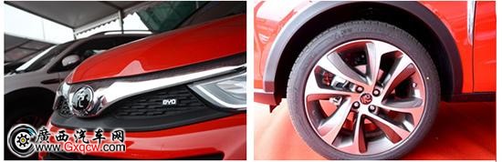 從現(xiàn)場實車來看,元的設(shè)計時尚動感,前臉個性突出,暗藏一個“元”字,組合燈、黑色飾條與“飛翼”式鍍鉻裝飾勾勒出屋檐狀格柵,將“龍鱗式”網(wǎng)格襯托得層次分明;配合雙色車身設(shè)計、炫酷的18寸超大尺寸輪轂造型,外觀更加吸引眼球。而外掛式備胎設(shè)計,更是點睛之筆。