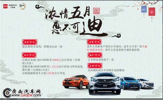 吃粽子,賽龍舟,又到一年粽葉飄香時(shí),端午節(jié)就要來了,比亞迪南寧佳之迪為新老客戶推出一場(chǎng)濃情五月 惠不可迪,比亞迪南寧佳之迪端午搶購會(huì),活動(dòng)期間只要到店就有神秘端午禮品相送,訂車購車除了享受抄底價(jià)格之外,還有精彩大禮相贈(zèng)。