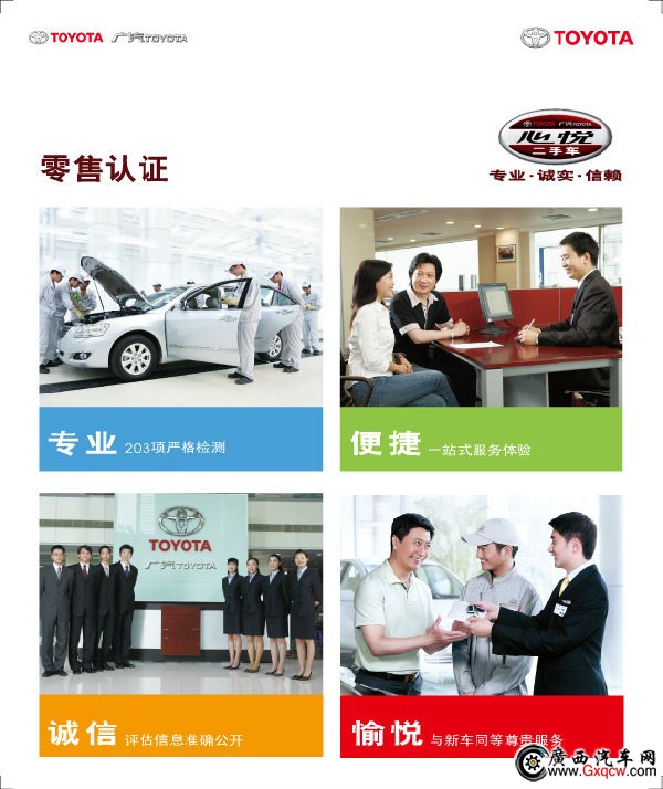 廣汽豐田“心悅二手車”結(jié)合國(guó)內(nèi)情況,制定出高達(dá)203項(xiàng)的二手車檢測(cè)標(biāo)準(zhǔn),遠(yuǎn)遠(yuǎn)高于《規(guī)范》的規(guī)定范圍,是目前業(yè)界最嚴(yán)格最完備的檢測(cè)標(biāo)準(zhǔn)之一。在二手車領(lǐng)域,以顧客需求為導(dǎo)向的廣汽豐田一直都走在行業(yè)之先,建立起以“專業(yè)、誠(chéng)實(shí)、信賴”為三大核心價(jià)值的“心悅二手車”品牌。其中二手車專業(yè)評(píng)估鑒定業(yè)務(wù)更是以其專業(yè)、誠(chéng)信的服務(wù),樹立起行業(yè)的標(biāo)桿,引領(lǐng)二手車評(píng)估鑒定服務(wù)向規(guī)范化的方向發(fā)展,也因此贏得了顧客的信賴,獲得業(yè)界和顧客的一致認(rèn)可。