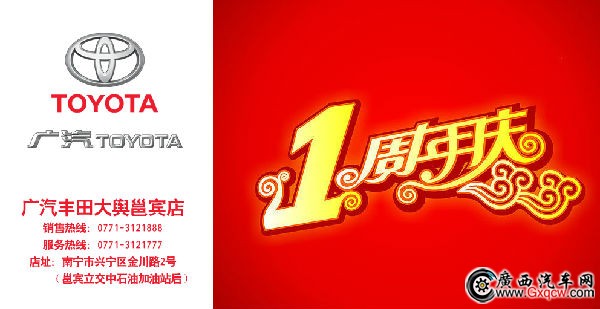 廣汽豐田大輿邕賓店開業(yè)一周年啦!經(jīng)過2012一年的發(fā)展,我店取得了不俗的成績,與各位客戶、車主搭建了深厚友誼橋梁。為表示對各位客戶的感謝,我店在1月12日將在店舉辦一周年店慶暨新春感恩回饋活動(dòng),望各位廣豐大輿店的老客戶來店與我們一起歡度店慶,也恭候各位對廣汽豐田感興趣的新朋友、新客戶的光臨。