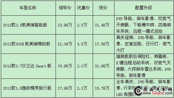 廣汽豐田大輿邕賓店展位和展廳同時(shí)享受車(chē)展特惠價(jià),凱美瑞、漢蘭達(dá)、逸致、雅力士四款車(chē)型萬(wàn)元鉅惠,歡迎廣大車(chē)友到I8廣汽豐田大輿邕賓店展位賞車(chē)訂車(chē)。詢:0771.3121888。