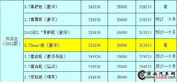 2013年04月19日-2013年04月27日,廣汽豐田大輿邕賓店漢蘭達*高優(yōu)惠2.5萬元,感興趣的朋友可以到店咨詢購買,具體優(yōu)惠信息請見下表: