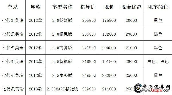 2013年6月1日-6月30日,廣汽豐田大輿邕賓店凱美瑞*高優(yōu)惠3萬元,感興趣的朋友可以到店咨詢購買,具體優(yōu)惠信息請(qǐng)見下表: