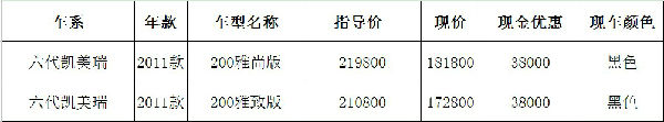 2013年6月1日-6月30日,廣汽豐田大輿邕賓店經(jīng)典版凱美瑞*高優(yōu)惠3.8萬元,感興趣的朋友可以到店咨詢購(gòu)買,具體優(yōu)惠信息請(qǐng)見下表: